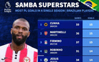 巴西球员英超单赛季进球榜:库尼亚、马丁内利、菲尔米诺15球第1